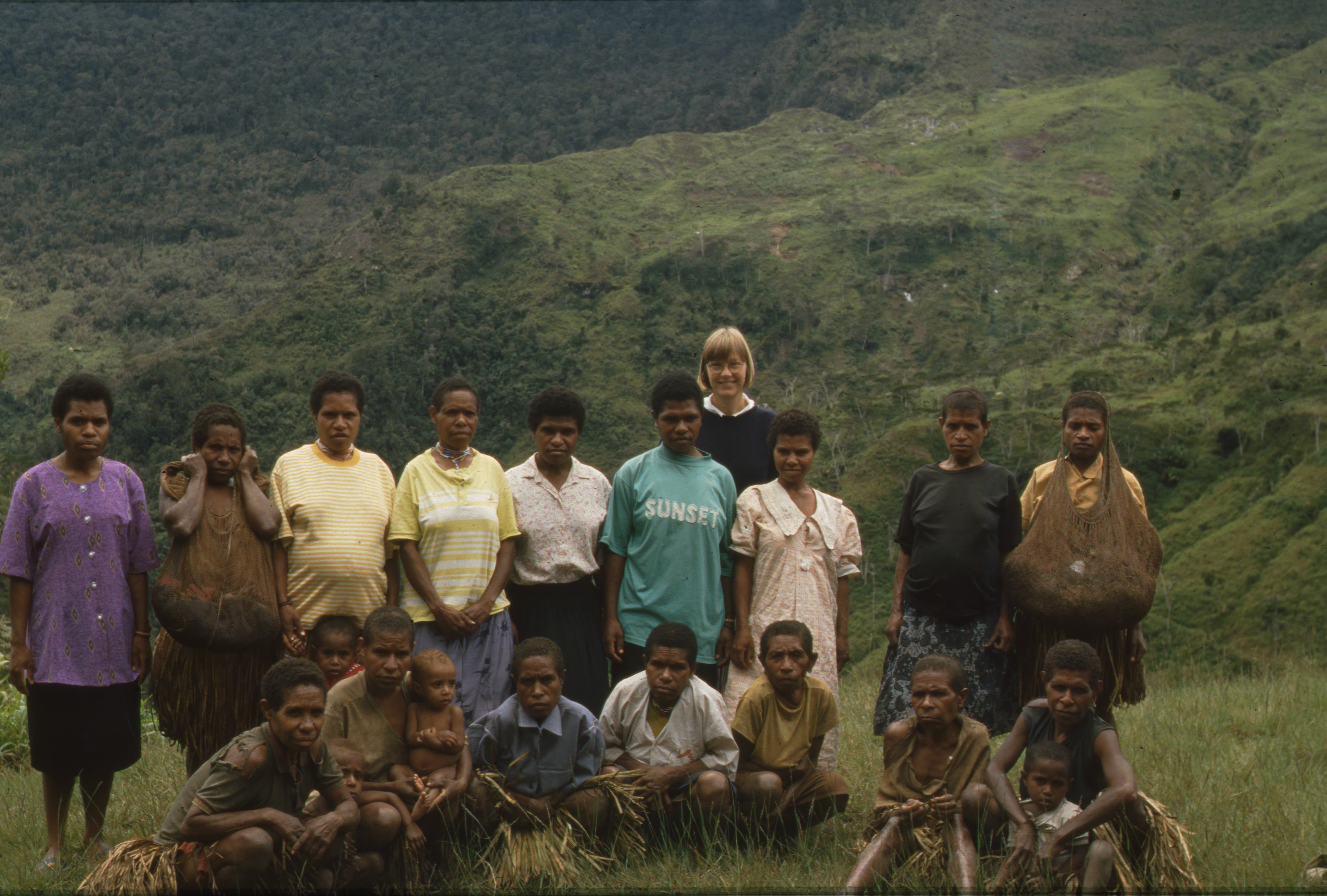 Annemieke Vader in Bomela, Papoea, met een groepje dorpsvroedvrouwen