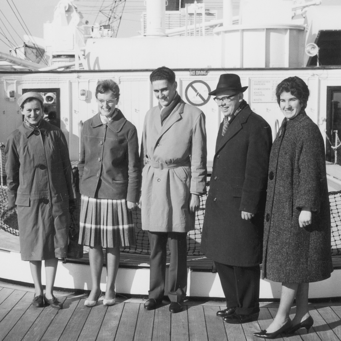 Het zendingsteam staat klaar voor vertrek. Het is een winterse dag. Op de kade wordt een foto gemaakt. Van links naar rechts staan zuster Dini Sonneveld, echtpaar Ten Voorde en echtpaar Kuijt.