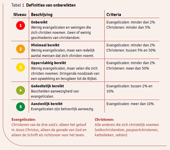Voor het in kaart brengen van onbereikte bevolkingsgroepen hanteert Joshua Project een indeling in vijf niveaus (tabel 1). De foto bovenaan dit artikel geeft een indruk van de verspreiding van onbereikte volken over deze wereld.