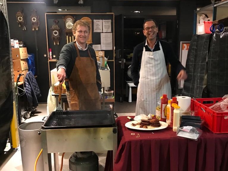 Zeker honderd mensen bezoeken de bijeenkomst. Ze worden getrakteerd op koffie met iets erbij. Ook worden hamburgers gebakken, die gretig aftrek vinden en bijdragen aan een gezellige, ongedwongen sfeer.