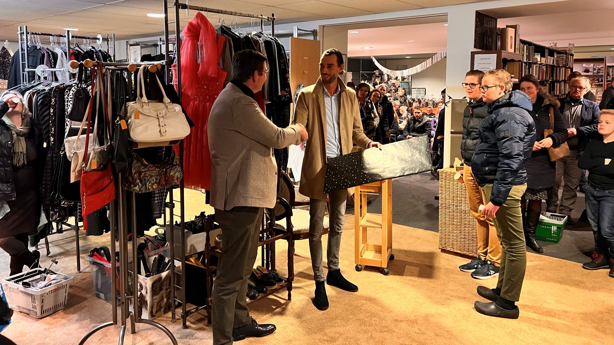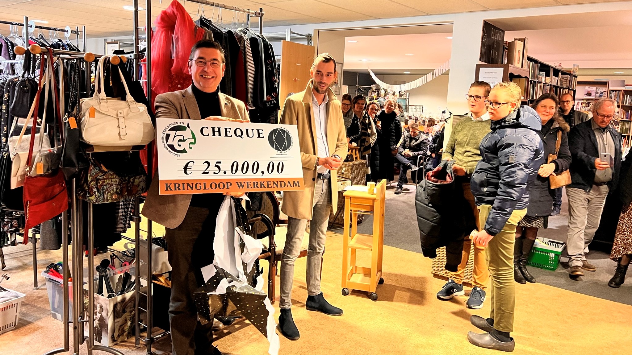 Vervolgens overhandigt de voorzitter een ingepakte cheque aan Lennard Elenbaas die namens ZGG aanwezig is. Het prachtige bedrag van € 25.000 wordt onthuld. Deze opbrengst wordt in overeenstemming met de doelstelling van de kringloopwinkel volledig geschonken aan ZGG.