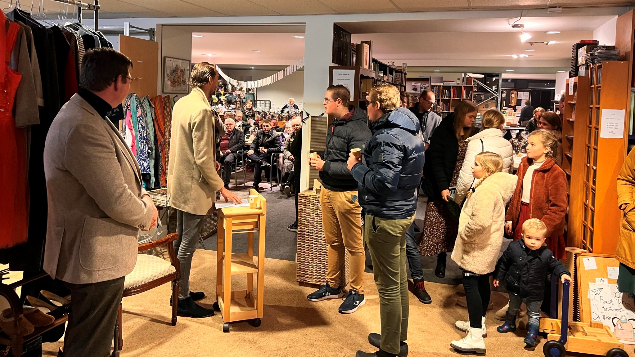 Voorzitter van het bestuur Sander Molenaar neemt kort het woord en bedankt ds. H.J. Agteresch en alle vrijwilligers voor hun aanwezigheid. Namens het bestuur spreekt hij zijn waardering uit voor ieders inzet vanaf de opening tot nu toe. Het bestuur is blij en verwonderd dat ze vanavond de eerste opbrengsten kunnen afdragen.