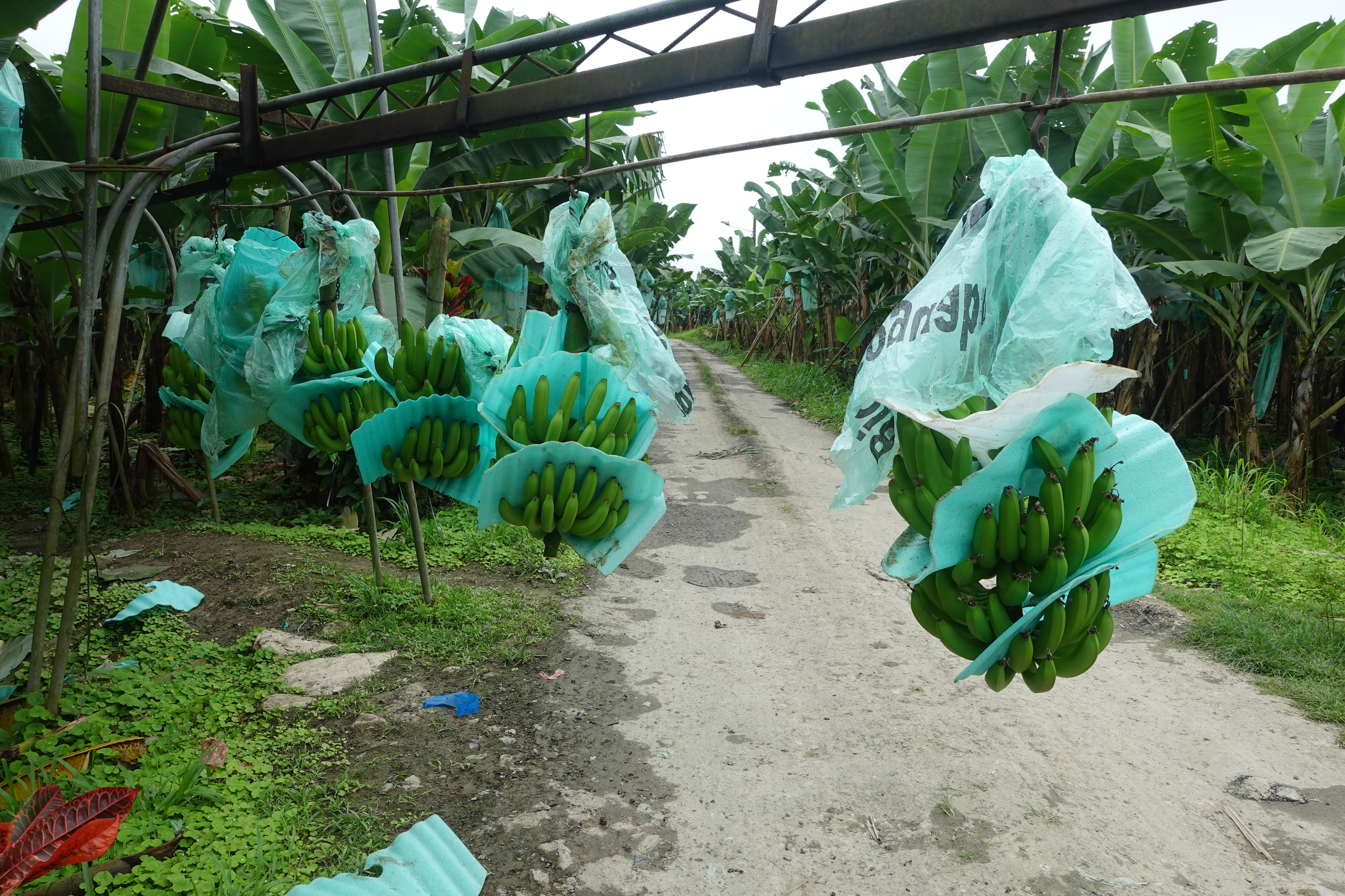 Buiten de stad Machala zijn veel bananenplantages te vinden. Zie je hoe groot de trossen zijn die van de bomen komen?