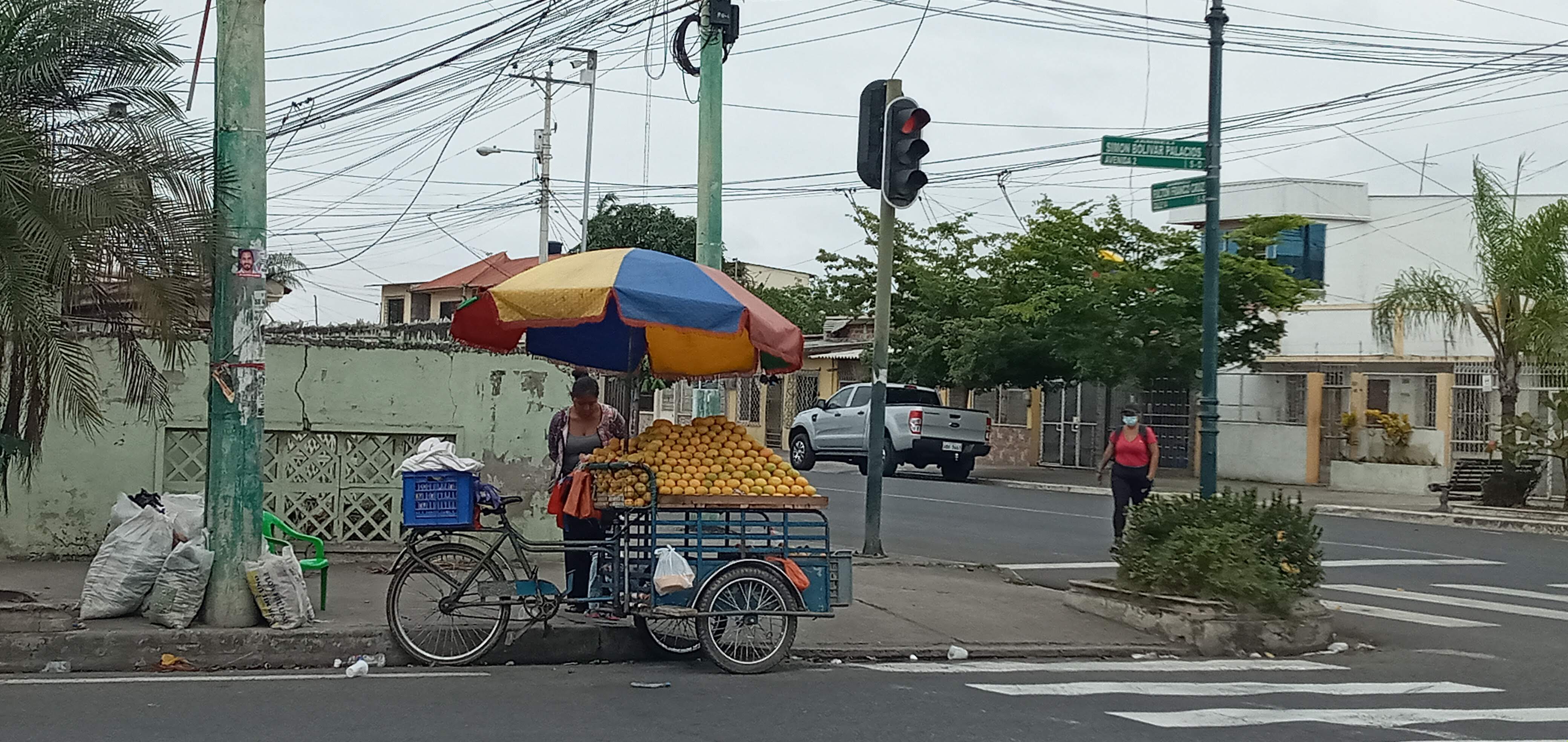 Als de mango's rijp zijn, kun je ze overal in Machala kopen. Deze verkoper verkoopt ze vanaf een tricyclo, een driewielfiets.