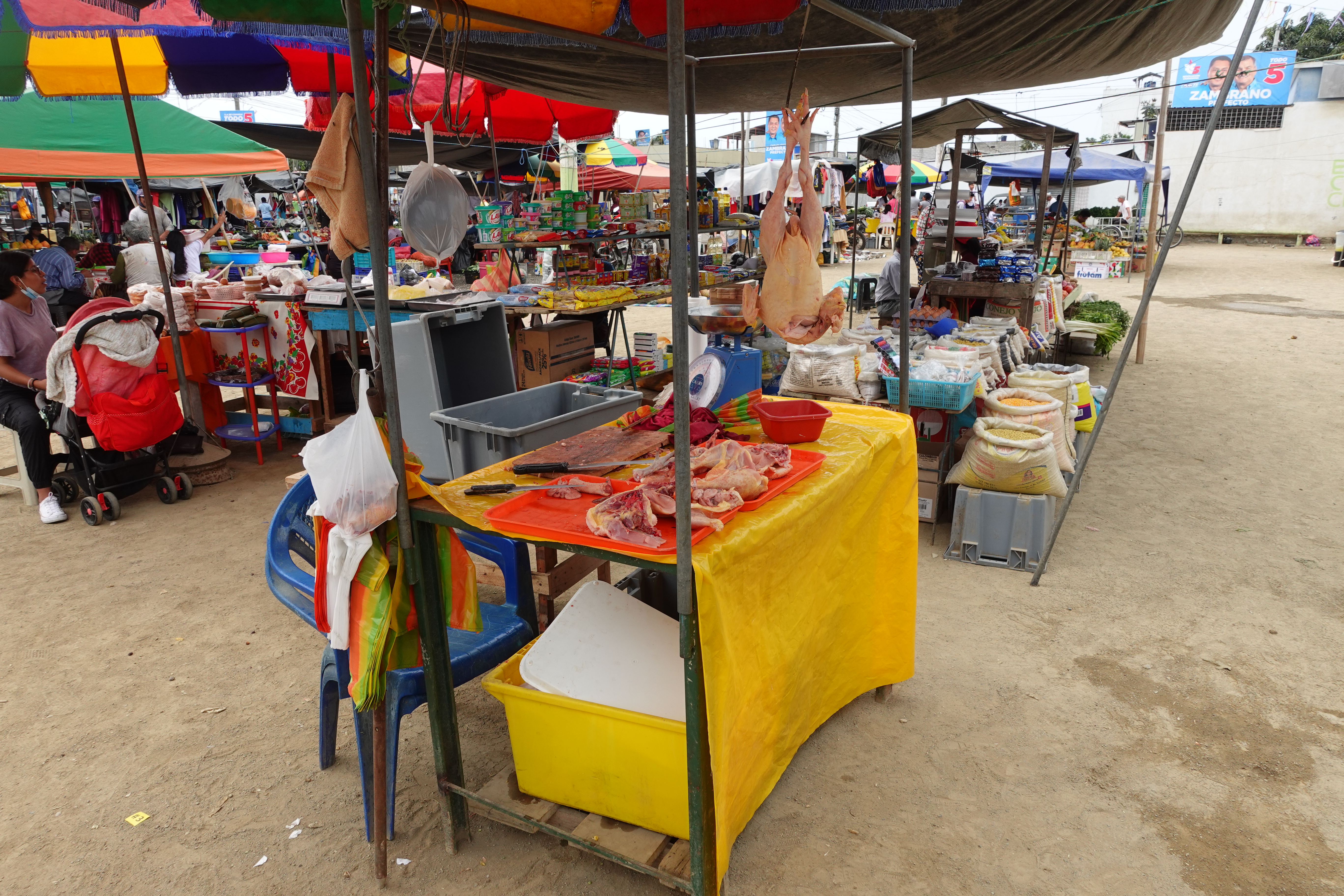 Ook vlees ligt in de open lucht op de marktkraam. Bedenk dat het altijd warm is in Ecuador... En dat het vlees daar soms een héle dag in ligt...