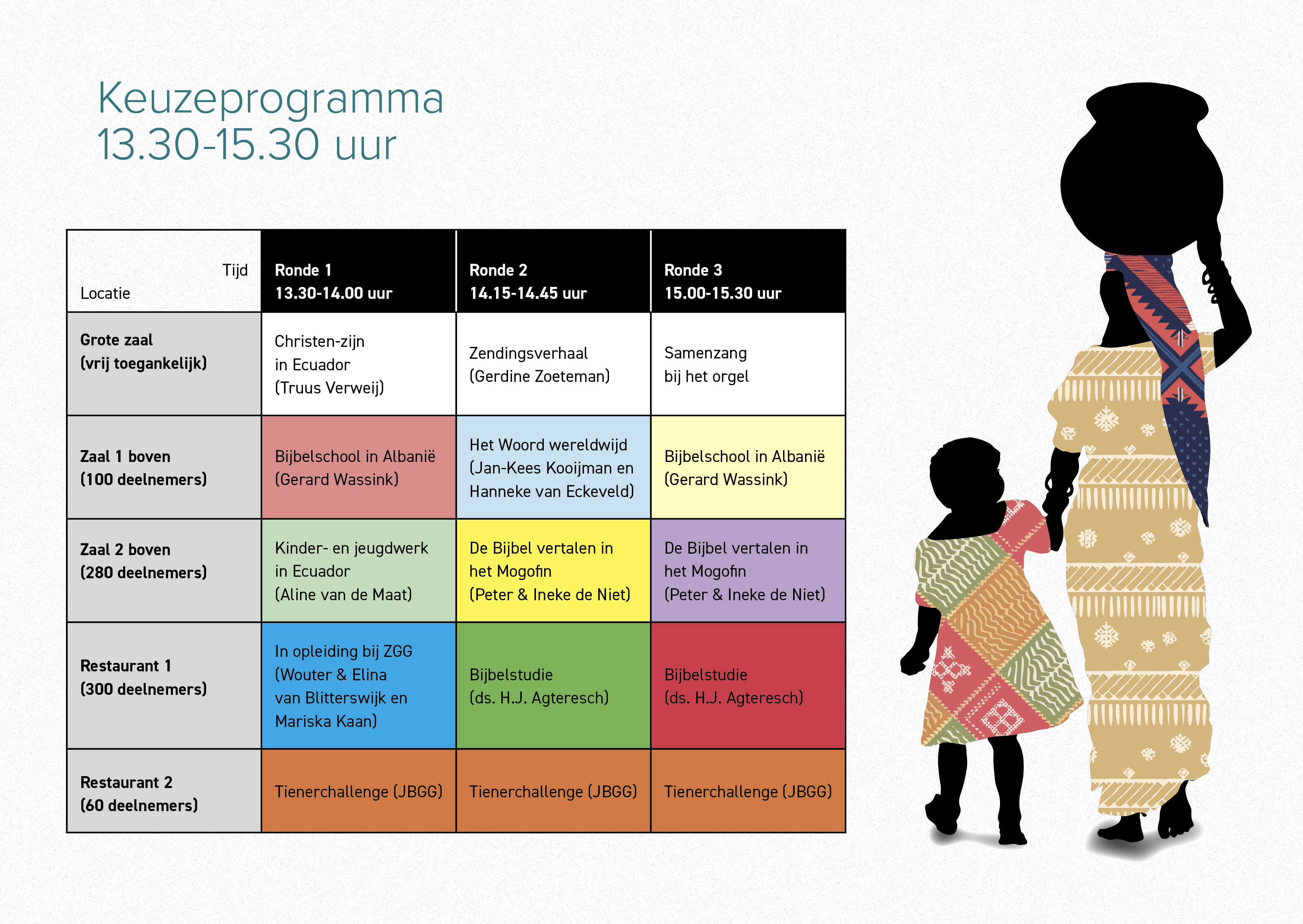 Tijdens de middag kunnen bezoekers kiezen uit een heel aantal programma-onderdelen in verschillende ruimtes. In onderstaand schema vindt u de indeling. Daaronder worden de programma-onderdelen toegelicht.